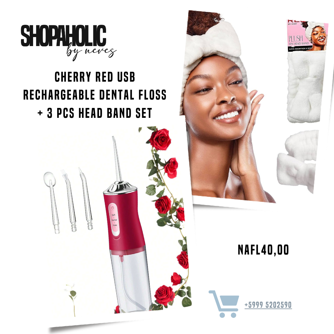 CHERRY RED USB RECHARGEABLE DENTAL FLOSS + 3 PCS HEAD BAND SET